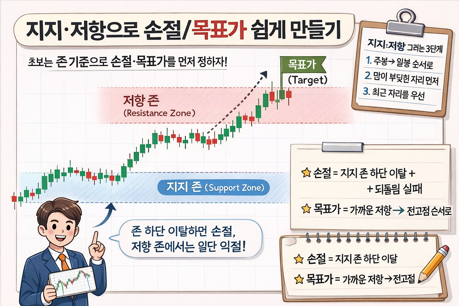 초보 투자자가 손절을 못하는 가장 큰 이유는 손절을 단순히 '손실 확정'으로만 인식하기 때문입니다. 하지만 손절의 진짜 의미는 "내 시나리오가 틀렸음을 인정하고 다음 기회를 사는 비용"입니다. 손절 라인 설정의 핵심 공식은 간단합니다. 손절 = 지지 존 하단 이탈 + 되돌림 실패입니다. 이는 단순히 가격이 지지선을 살짝 깨졌다고 즉시 손절하는 것도 아니고, 깨져도 무작정 버티는 것도 아닌, 명확한 기준을 제시합니다. 구체적인 판단 기준은 다음과 같습니다. 첫째, 지지 존 하단을 명확히 이탈했는가를 확인합니다. 둘째, 이탈 후 다시 올라와서 지지를 회복했는가를 관찰합니다. 셋째, 회복에 실패하면 손절 기준이 명확해집니다. 이 과정에서 중요한 것은 종목의 특성에 따라 여유를 다르게 가져가야 한다는 점입니다. 변동성이 큰 종목은 지지선 아래로 1~2% 정도 여유를 주는 것이 합리적이며, 대형주는 상대적으로 타이트하게 손절 라인을 잡는 편이 효과적입니다. 많은 초보자들이 매수 이후 흔들릴 때 "본전만 오면 나간다"는 생각에 사로잡힙니다. 그러나 이는 시장이 아닌 자신의 매수가를 기준으로 판단하는 오류입니다. 시장은 여러분의 매수가를 알지 못하며, 오직 지지와 저항이라는 객관적 기준으로만 움직입니다. 따라서 매수 이후 기준은 반드시 지지·저항 기반이어야 하며, 개인의 손익 상황과는 분리해서 판단해야 합니다. 손절 라인을 미리 정해두면 가격이 흔들릴 때 감정적 판단을 배제하고 기계적으로 대응할 수 있어, 큰 손실을 방지하고 다음 기회를 기다릴 여력을 확보할 수 있습니다. 실전에서 손절을 실행하는 것은 심리적으로 어렵습니다. "조금만 더 버티면 오르지 않을까"라는 생각이 들기 마련입니다. 하지만 지지 존 하단 이탈 후 회복 실패라는 명확한 신호가 나왔다면, 그것은 현재 시장의 힘이 매수세보다 매도세가 강하다는 객관적 증거입니다. 이때 손절은 손실이 아니라 더 큰 손실을 막고 자본을 보존하는 현명한 선택이 됩니다. 초보 탈출의 첫 걸음은 바로 이런 기계적 손절을 실행할 수 있는 규율을 갖추는 것입니다.박스권 매매를 포함한 실전 목표가 설정 전략