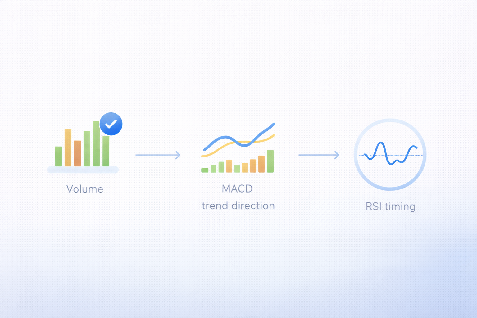 거래량(진짜 힘) → MACD(방향) → RSI(타이밍)